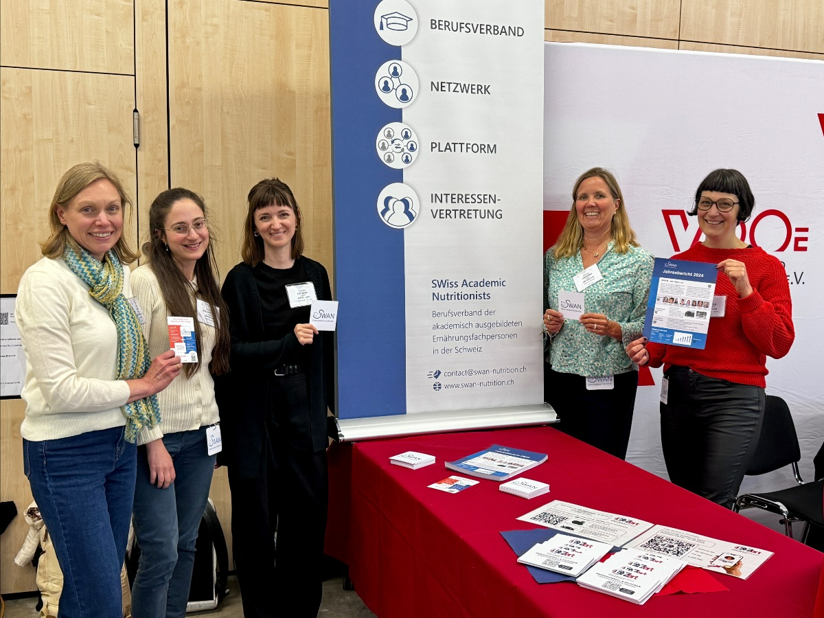 Bei der diesjährigen Dreiländertagung Nutrition 2025 in St. Gallen war SWAN gleich mehrfach präsent. Zusammen mit unserem Kooperationspartner Berufsverband Oecotrophologie VDOE waren wir mit einem gemeinsamen Stand vertreten. Nur ein paar Schritte dahinter fand am Freitagvormittag die von SWAN organisierte Session zu den neuen Ernährungsempfehlungen in Deutschland, Österreich und der Schweiz statt. Herzlichen Dank an alle Involvierten. (v.l.n.r.: Isabelle Frey-Wagner, Samantha Ballo-Peters, Rebekka Dietsche, Melanie Loessner, Esther Infanger) |