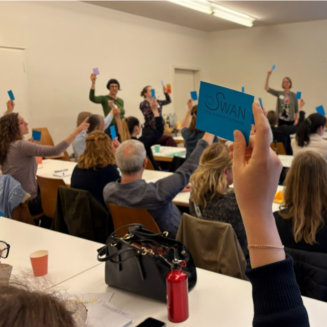 SWAN Mitgliederversammlung - Rückblick Am 27. Mai haben wir in Bern unsere 7. ordentliche Mitgliederversammlung durchgeführt. Wir haben an diesem Tag einige Mentees, aber auch unsere Co-Präsidentin und langjähriges Vorstandsmitglied Klazine van der Horst mit einem Ehrenschwan verabschiedet. Herzlichen Dank an Klazine für ihren wertvollen Einsatz. Mit Joyce Haddad können wir unseren Vorstand weiter verstärken. Joyces` Anliegen ist es besonders unser Engagement für internationale SWAN-Mitglieder zu stärken #belonging. Herzlich willkommen, Joyce! Neu wird Isabelle Frey-Wagner zusammen mit Esther Infanger das Co-Präsidium von SWAN übernehmen. Ebenfalls: Herzlich willkommen, Isabelle! Und wie immer gab es ausreichend Gelegenheit für Austausch und Netzwerken.